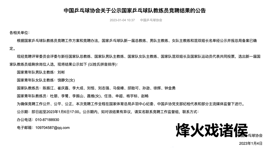 洛杉矶奥运周期国乒熏陶员竞聘后果(中国乒协官网截图)