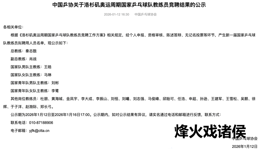在国乒2026新赛季首战无缘冠军激勉哗然的次日,中国乒协1月12日公布了洛杉矶奥运周期国度队熏陶员竞聘后果公示。比拟于巴黎奥运周期,此次中枢四东谈主指挥班子的变动在预感之中,而国乒熏陶员的名单中则挑升外和惊喜。