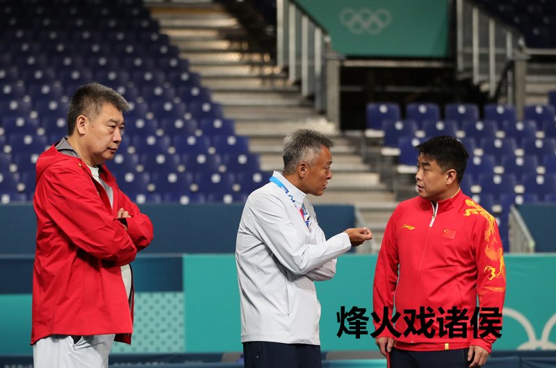 国乒进行巴黎奥运会赛前西席时,李隼、秦志戬、王皓(从左至右)在西席中疏通(新华社)